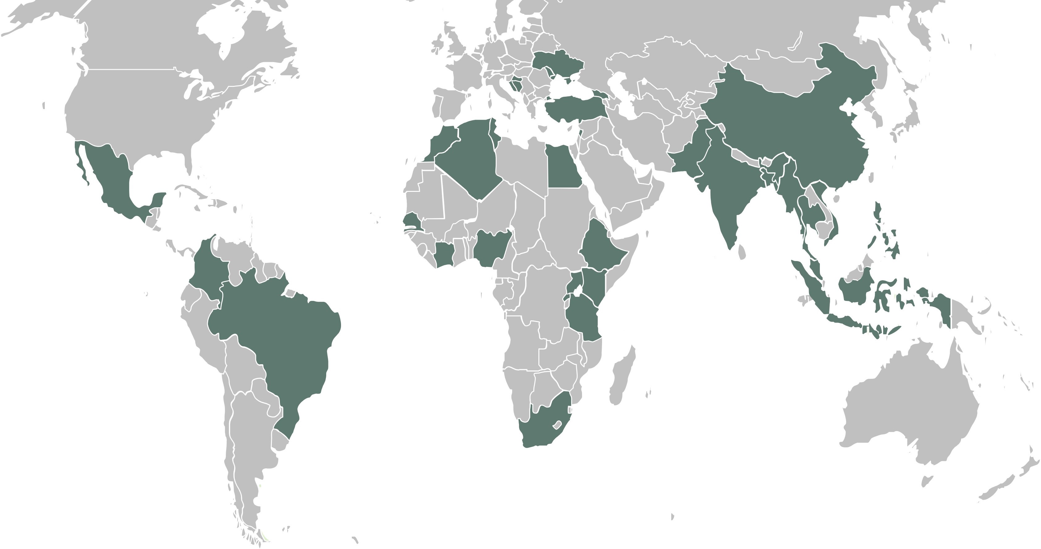 Lande: Kina, Bangladesh, Indonesien, Indien, Vietnam, Kenya, Nigeria, Sydafrika, Mexico og Ukraine.