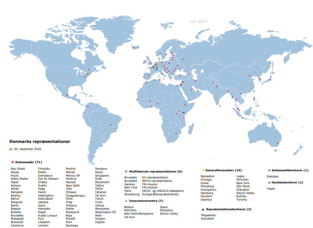 Danmark har i alt 103 repræsentationer (ambassader, generalkonsulater, innovationscentre, handelskontorer etc.) i udlandet per november 2024.